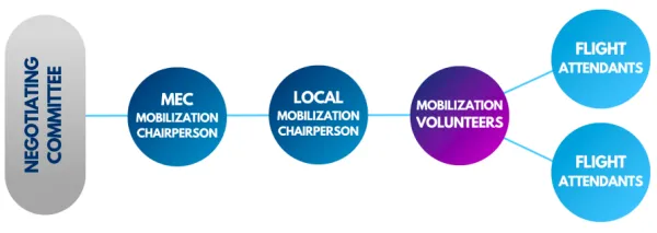 The Mobilization Committee also works to provide support to the Negotiating Committee through coordinated solidarity activity and two-way communication between the membership and the committee. Volunteers will work closely with the Local Mobilization Committee Chairperson to call other members to action through participation in organized solidarity activities and a program of information sharing with Flight Attendants.